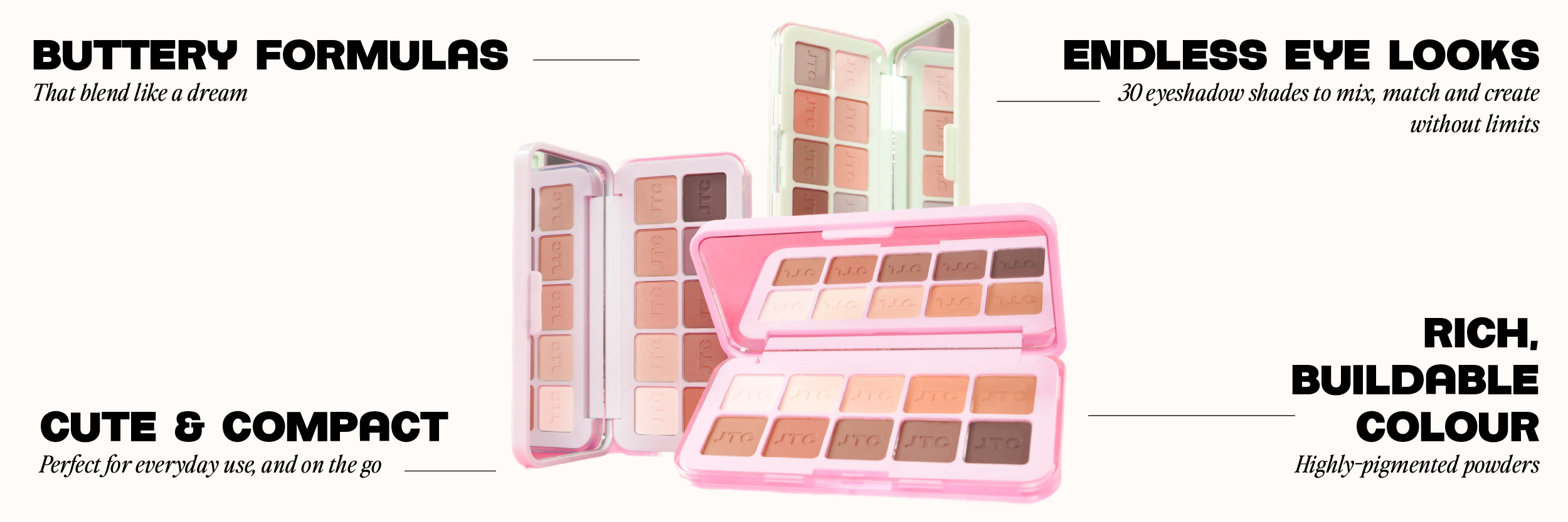 Three palettes. Endless moods. From subtle to statement, no makeup wipe required.